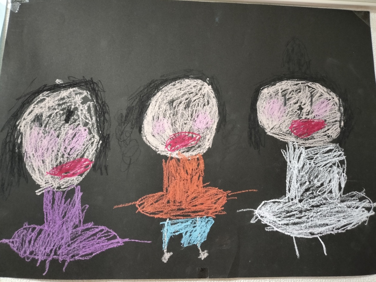 黒い画用紙に描いているのが珍しく、3人が並んでコンサートを見ている様子が可愛く描かれていました♪